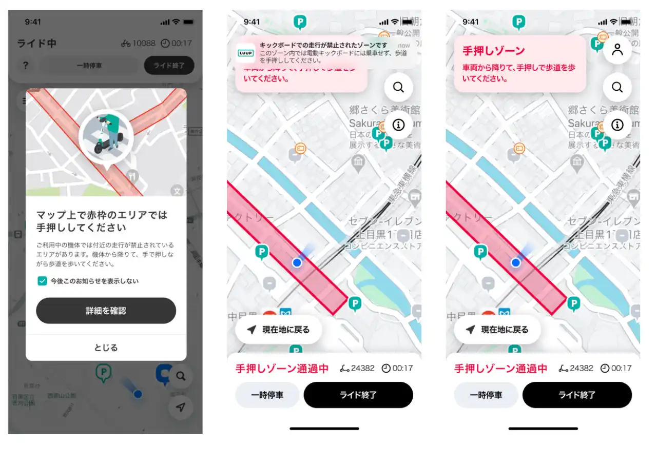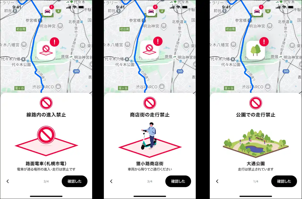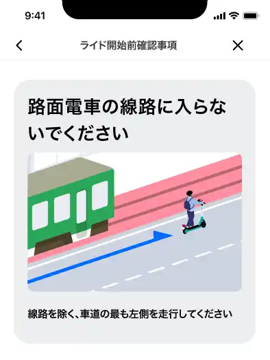 降りて手押しをしなければいけない乗車禁止エリアに入ると当該通知をアプリ上で表示します。 本機能は、電動アシスト自転車、電動キックボードどちらのライドでも適用されます。 |