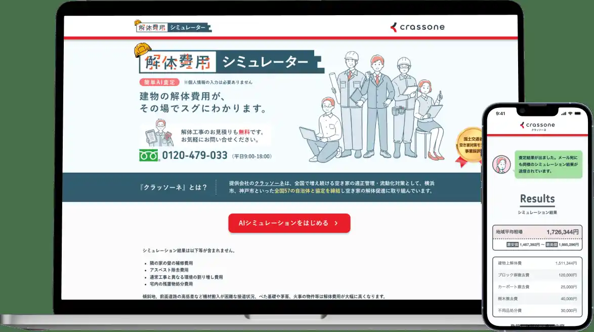 スマートフォンやパソコンから10個の質問に答えるだけで、遠隔地からでも解体費用の相場が把握可能なサービスです。過去12万件の見積もりデータをもとに概算費用を算出しており、個人情報の登録をすることなく利用することができます。 |