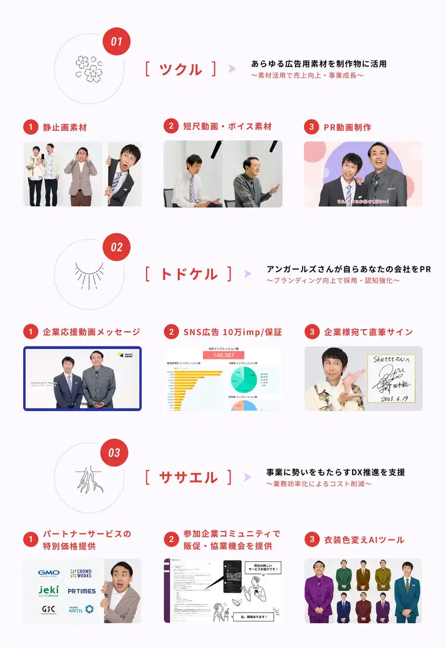 具体的には、地方出身のタレントの静止画/動画素材(ツクル)、10万/imp保証のmeta広告運用や応援動画メッセージ(トドケル)、各パートナー企業によるサービス優待(ササエル)といった、さまざまなサポートがセットになった、革新的なプランです。 |