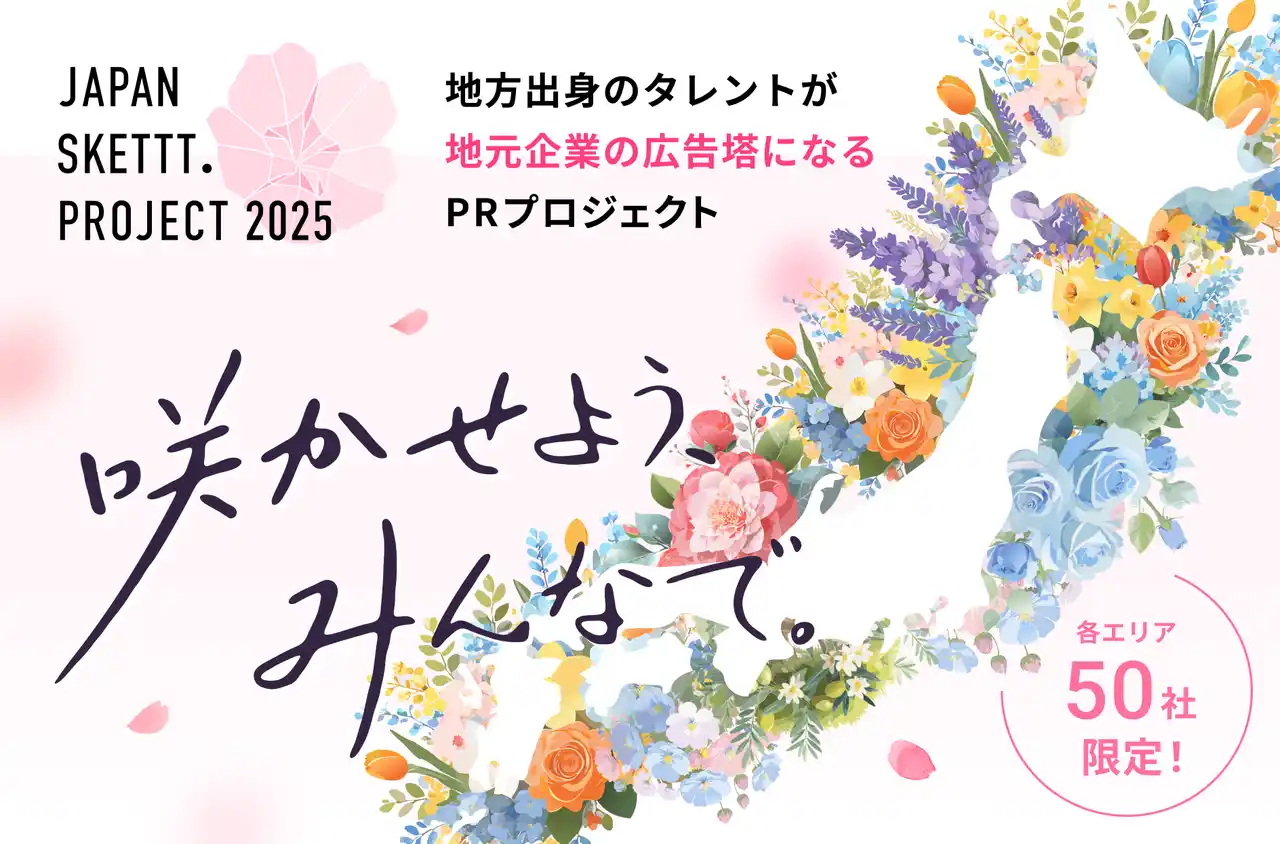 「JAPAN SKETTT. PROJECT(ジャパン・スケット・プロジェクト)」は、「咲かせよう、みんなで」をキャッチコピーに、地方出身タレントがPRでお困りの地元企業様を支援するプロジェクトです。 |