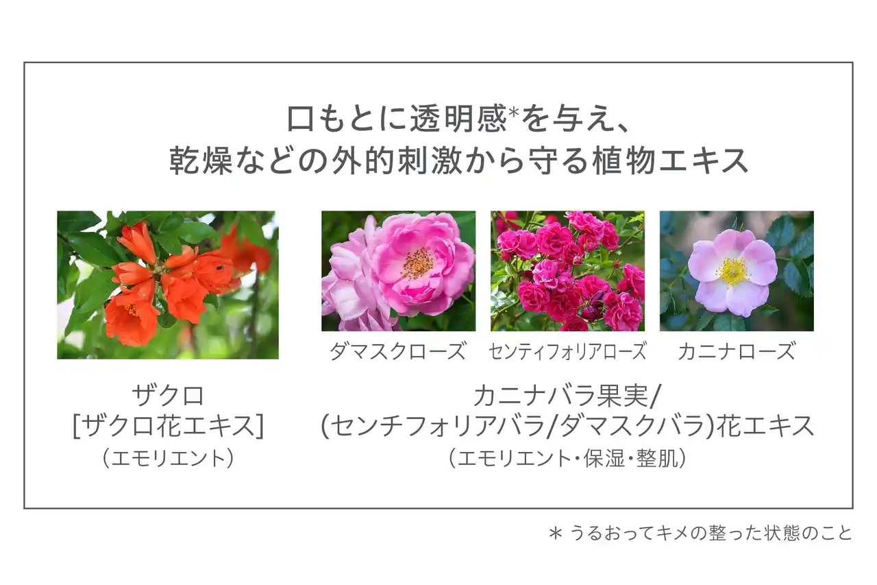 | べたつくことなくなめらかにのび広がり、ムラなく均一に仕上がります。唇の水分を抱え込む抱水性オイル*²を高配合しています。さらに高粘度オイル*³が唇の表面をラッピングするようにうるおいを閉じ込めながら密着感を高め、美しい仕上がりをキープします。 | |||||||||||