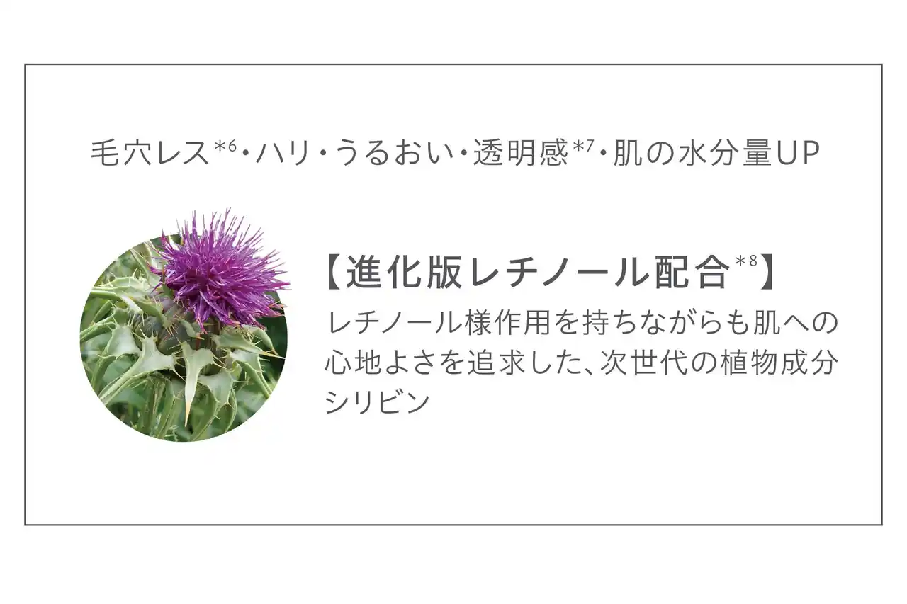 | *8 シリビン[レチノール様作用(ハリ・整肌)のある植物成分]*9 メイクアップ効果(効果には個人差があります) | |||||||||||