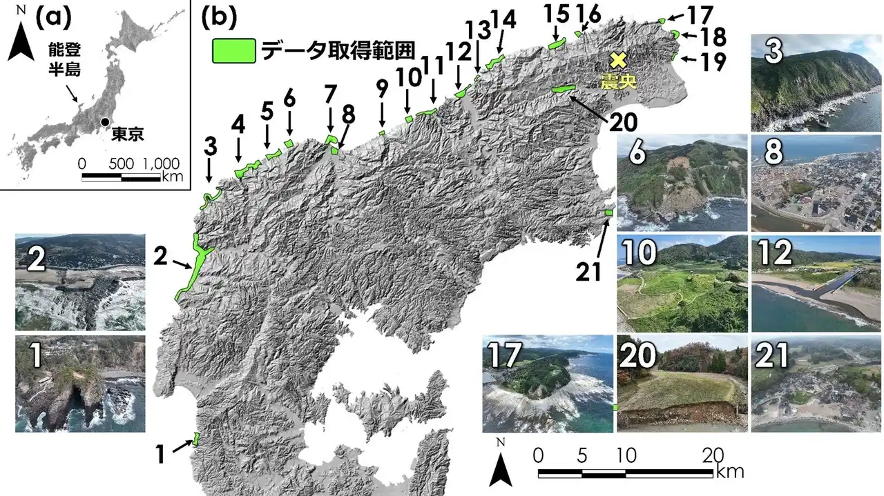 計測は、令和6年能登半島地震で隆起した海岸地形を中心として実施した(図2)。 |