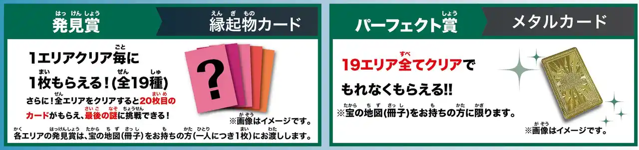 見事19エリアをクリアした探検隊は、パーフェクト賞の 「メタルカード」と20枚目のカードが手に入り、最後の謎解きにチャレンジできますよ。 |