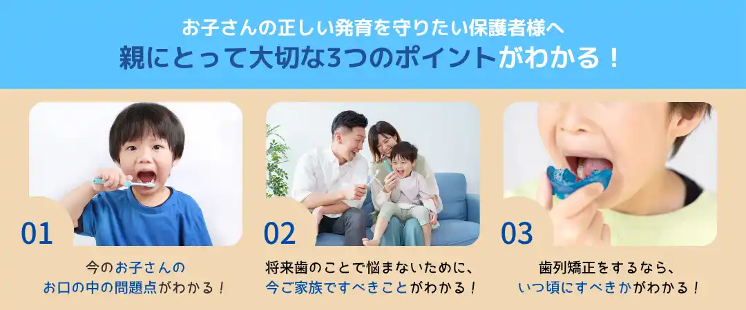 | 歯ならびの問題だけでなく、むし歯などの治療タイミングがわかります。矯正治療を検討している場合は、開始すべきタイミングについてもご相談いただけます。 | |||