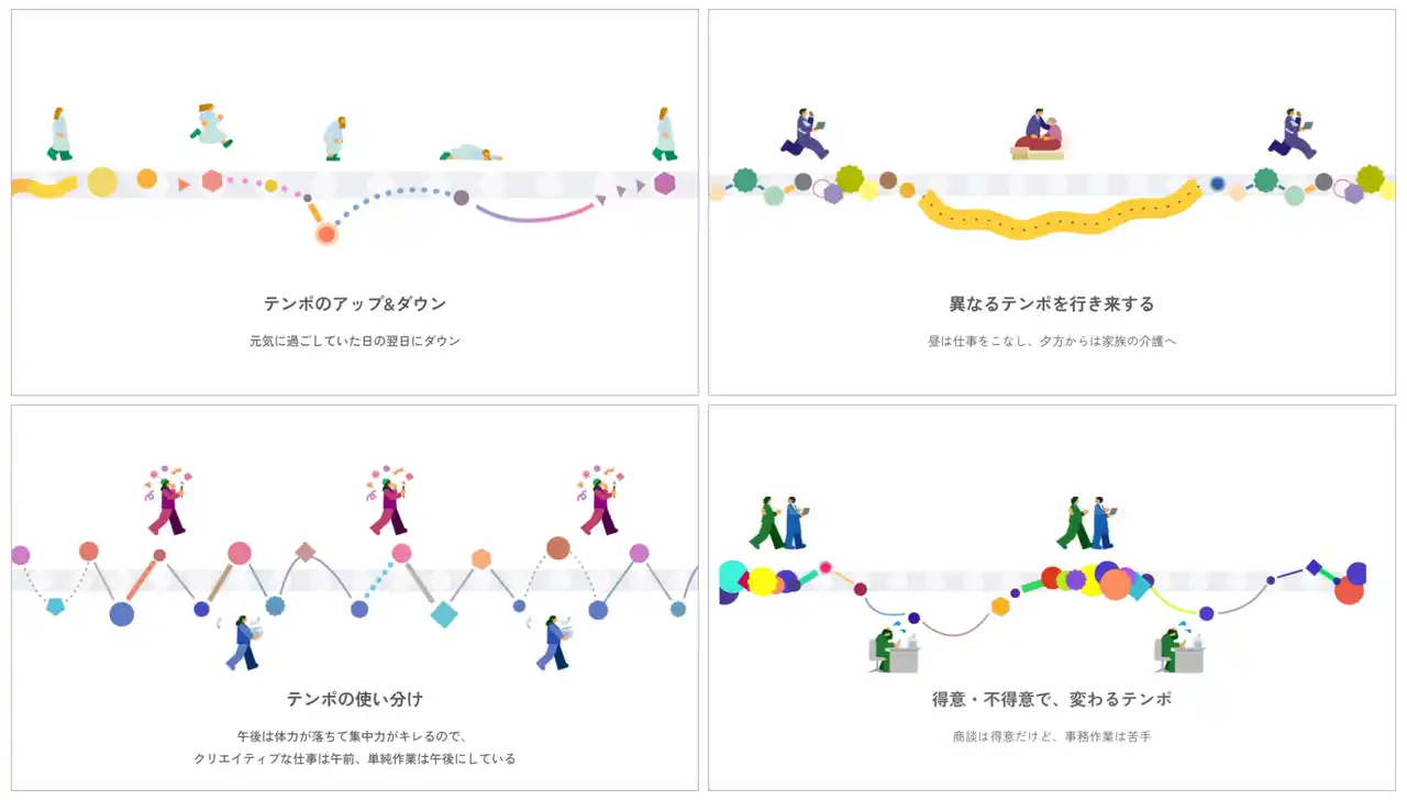 例えば、元気に過ごしていたのに急な体調の変化によりテンポが落ちることもあれば、出産により未知のテンポを迎える人もいるでしょう。また、日中は仕事、夜は家族の介護と、異なるテンポを行き来する人もいます。 |