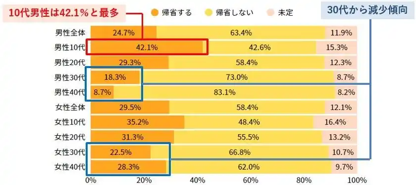性別では女性の方がやや帰省する割合が高い傾向にありますが、性別と年代を掛け合わせて見ると10代男性が4割強と最も高い帰省意向を示しています。男女ともに、10代・20代の若年層で帰省意向が高く、30代以降では徐々に低下する傾向が見られます。特に女性では30代が最も帰省意向が低く、40代になるとわずかに増加します。一方、男性では40代になると帰省意向が1割未満にまで急激に下がる傾向が見られます。これは前述の理由にもあるように30代・40代では管理職に就くなど仕事の責任が増す年代でもあり、またひとり暮らしが長くなるにつれて、その土地での友人や付き合いも増えることで、実家から足が遠のきやすい状況なども一因として考えられます。 |
