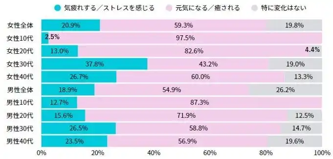 一方で、女性30代では「気疲れする/ストレスを感じる」と回答した人が4割近くにのぼり、この層で帰省意向が低くなる傾向との関係性がうかがえます。 |