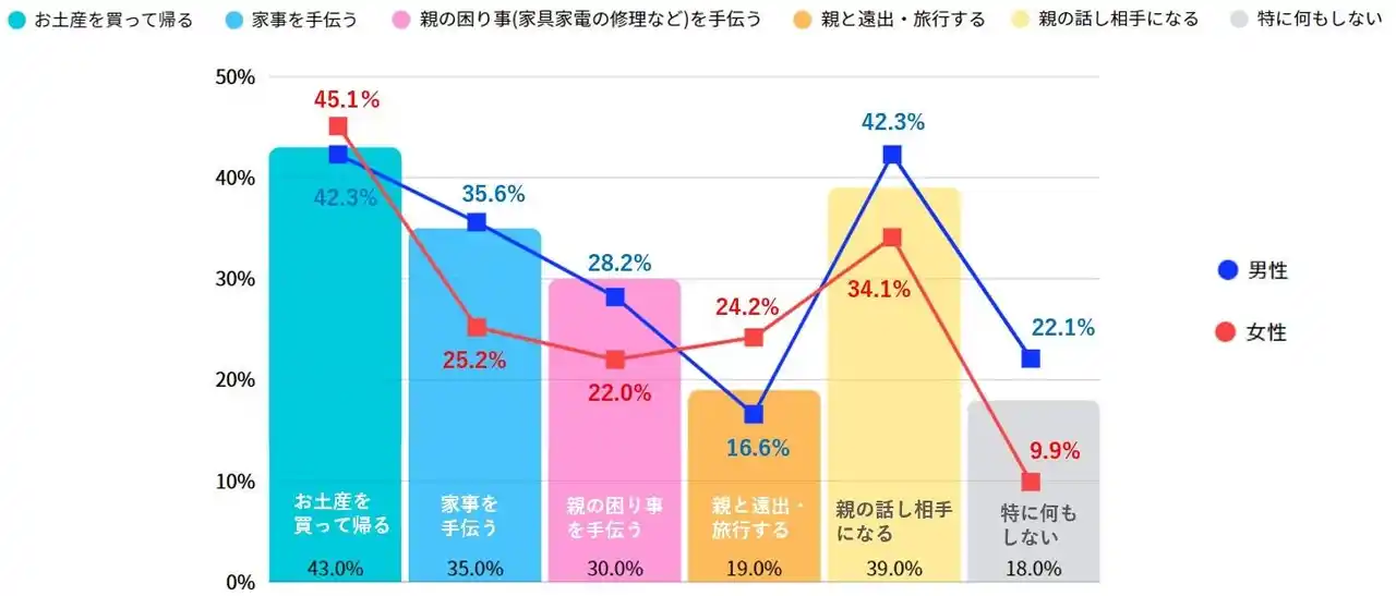 実家に帰省する際の行動としては、「お土産を買って帰る」と回答した人が43.0%と最も多く、約半数にのぼりました。続いて多かったのは「親の話し相手になる」で、全体の39.0%にのぼり、特に男性では42.3%と高く、普段はなかなか話す機会の少ない親とのコミュニケーションを重視している人が多いことがうかがえます。「何もしない」と回答した人は18.0%と少数派で、「家事を手伝う」や、実家の家具・家電の修理や庭掃除をするなどの「親が困っていることを手伝う」と回答した人は全体の約3割にのぼりました。これらの結果からお盆の帰省は単なる滞在にとどまらず、親のために何かをしたいという意識が伝わってきます。 |