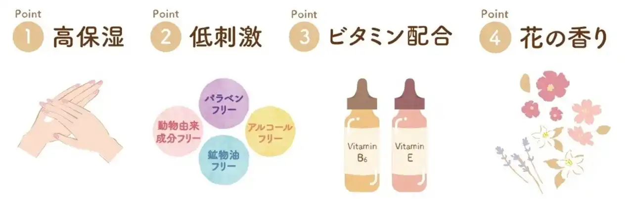 ・ しっかりうるおす、こだわりの高保湿 ・ 手荒れを防ぐ高保湿処方 ・ ほんのり上品な花の香り(微香性) ※無香料を除く ・ 肌にやさしい低刺激、4つのフリー処方 「アルコールフリー」「パラベンフリー」「動物由来成分フリー」「鉱物油フリー」 |