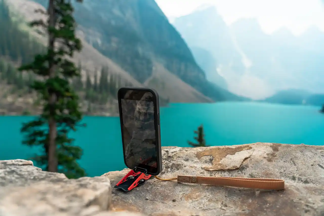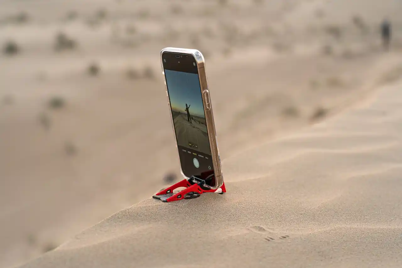 | 2本の脚を独立調整することで、不整地や傾斜でもしっかり設置可能。スマホを約1.27cm浮かせて設置できるため、地面の汚れからも守ります。 | |||