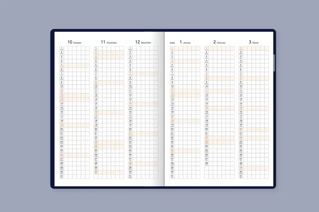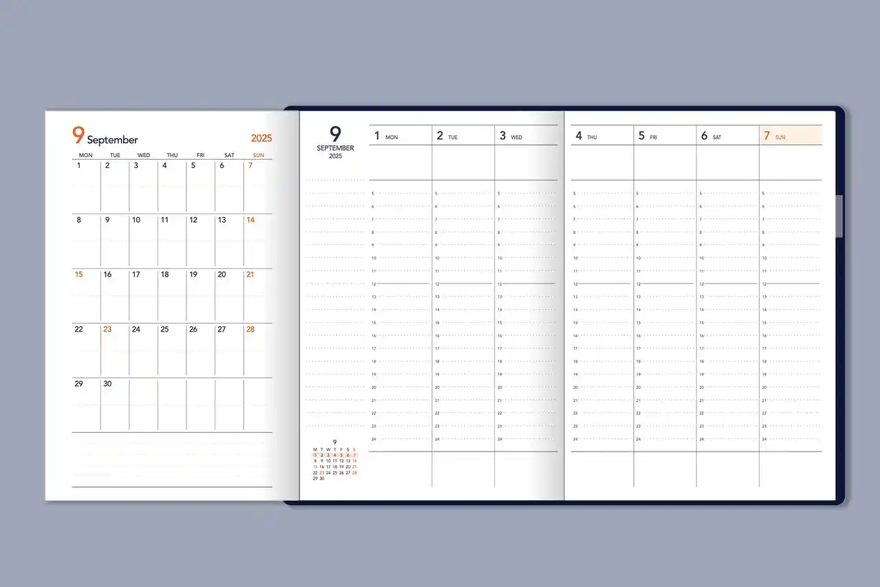 月と週の予定がひとめで見渡せるので、予定管理が素早く間違いなく行えるように。「タイパ」を重視する層だけでなく、タスクの多い社会人、家族の予定を管理する主婦層に絶賛されています。特殊な工程を必要とするため、製本技術に自信のある手帳メーカーだから実現した仕様です。 |