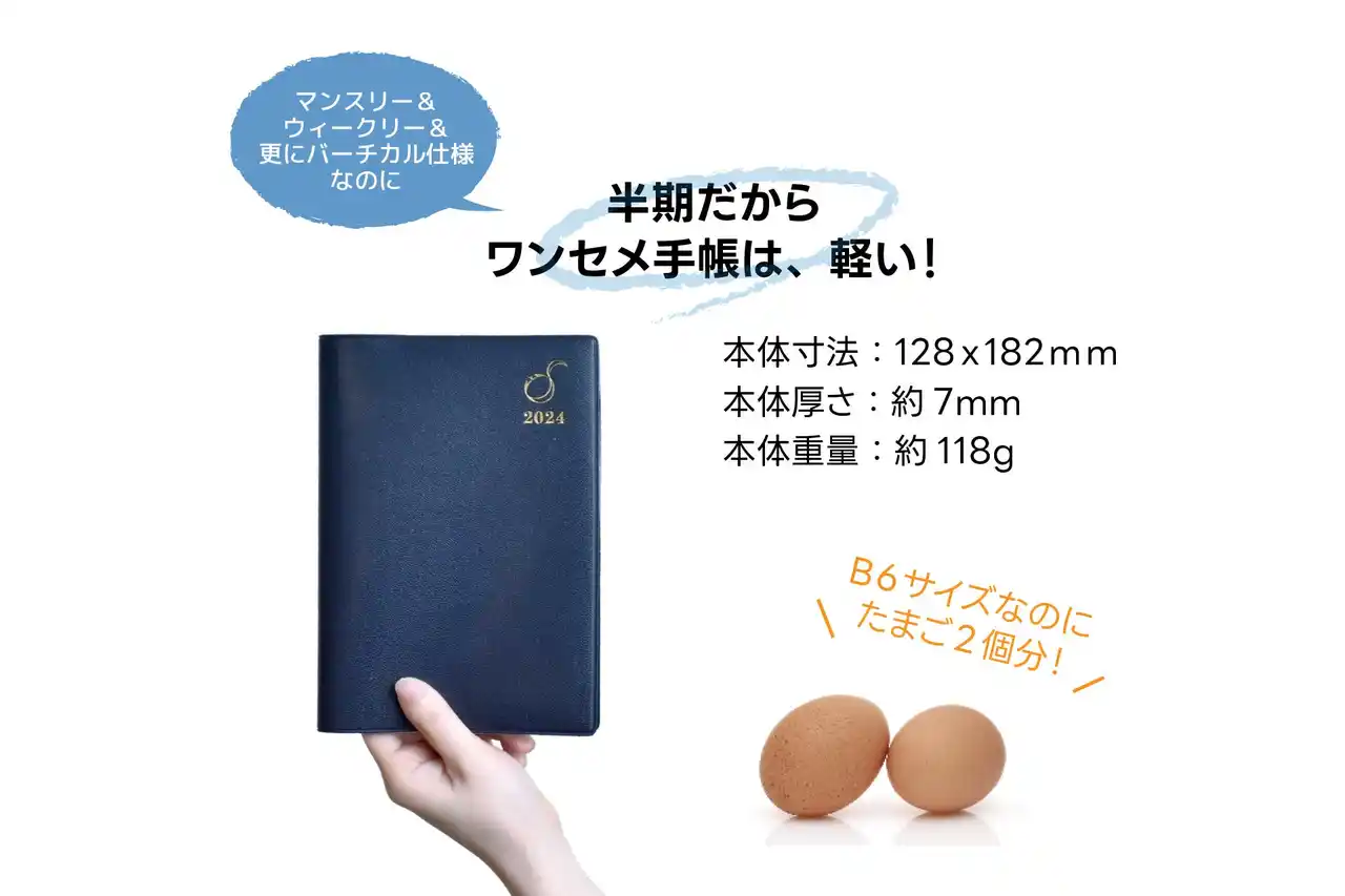 ワンセメ手帳は、前期(3月~8月)、後期(9月~3月)の上下に分かれた仕様です。これにより1冊が軽量化、しっかりと予定を書きたいけれど、荷物はコンパクトにしたいと考える層にヒットしました。 |