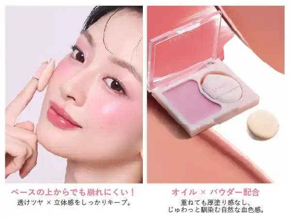 軽やかな発色とべたつかない使用感 オイルと発色パウダーを絶妙にブレンドし、肌に溶け込むような自然な発色を実現。重ねても厚塗り感がなく、ぼかしやすいため、自分好みに調整可能です。ベースメイクを崩さず、みずみずしい透明感のある立体感を引き出します。 |
