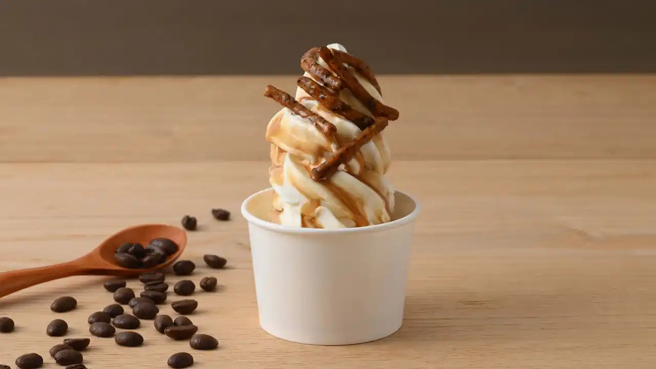 ※ 榮太樓總本鋪本店E-Chaya 北海道根釧牛乳ソフトクリームに「特製珈琲蜜と丸山珈琲かりんとう」のトッピング |