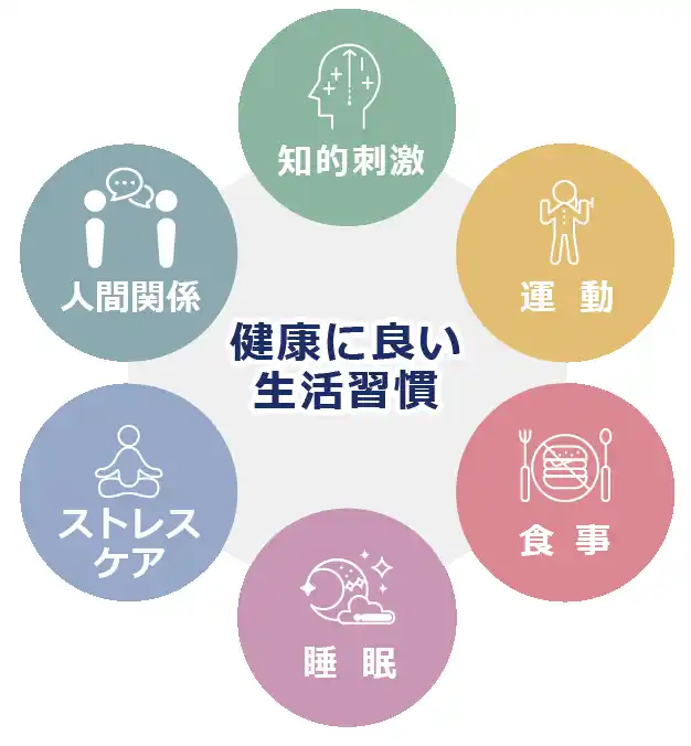 | ■睡眠・食事・ストレスケア・運動・知的刺激・人間関係の6領域から作る健康 | |||