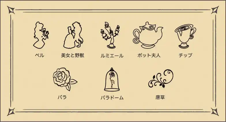 リングの内側に刻印できる、『美女と野獣』のストーリーにちなんだ絵文字も豊富に取り揃えています。 |