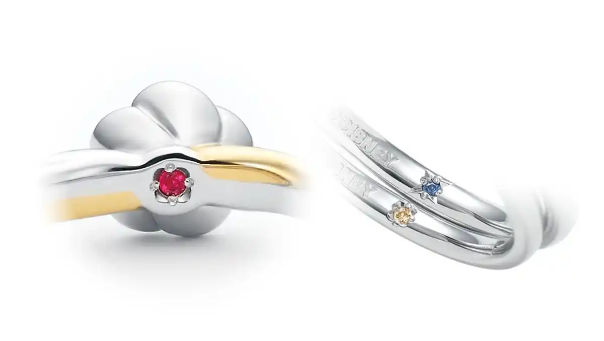それぞれのリング内側には物語の印象的な色” を表現しています。ベルの〈黄色〉、野獣の〈青〉、魔法のバラの〈赤〉。それぞれがもつイメージカラーとともに、願いを込めた宝石やモチーフをリングの内側に秘めお届けします。 |