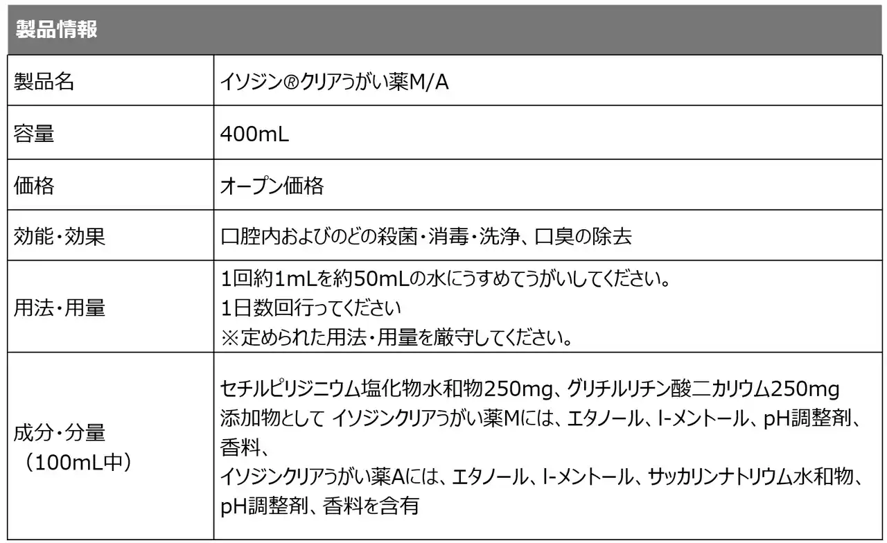 佳代子)は、「イソジン(R)クリアうがい薬M/A」(指定医薬部外品)から400mLの大容量タイプを2025年8月1日(金)より販売開始いたします。のどのバイ菌を直接撃退できる殺菌効果と透明タイプの使いやすさを両立した「イソジン(R)クリアうがい薬M/A」は、子どもを持つ親や日々の健康管理を大切にしたい方にとって、毎日ののどケアを手軽に続けられるのどケア製品として、機能性と使いやすさを両立しました。 |