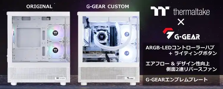 | PCケースは人気のThermaltake製 白色ミニタワー『View 170 TG ARGB Snow』に、オリジナルのカスタマイズを施した “G-GEAR White Edition 特別仕様” を採用。一般モデルとの違いは、『ARGB-LEDコントローラーハブ+ライティングボタンを新設』『側面2連ファンをエアフロー強化&内側から支柱を見せないようにリバースファンに変更』『G-GEARエンブレムプレート』など、PCパーツの取り扱いを長年行ってきた TSUKUMO の知識と経験を活かしたカスタマイズにより、デザイン性をブラッシュアップしました。 | ||||||||||||||||||
