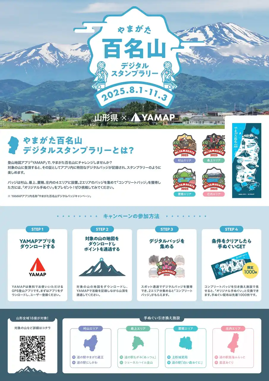やまがた百名山デジタルスタンプラリーの詳細は、YAMAP MAGAZINEの記事をご覧ください。(https://yamap.com/magazine/66396) |