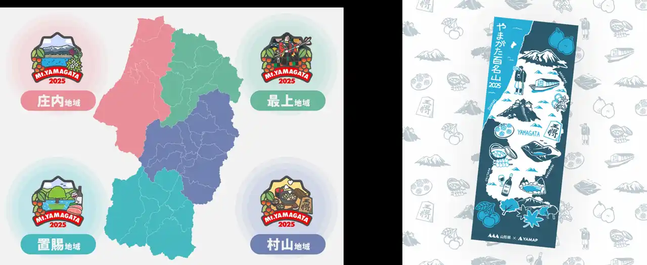 デジタルスタンプラリーでは、山形県にある「村山」、「最上」、「置賜」、「庄内」の4つの地域ごとに設定した対象の山を、YAMAPアプリを使って登ることで、デジタルバッジを獲得できます。 |