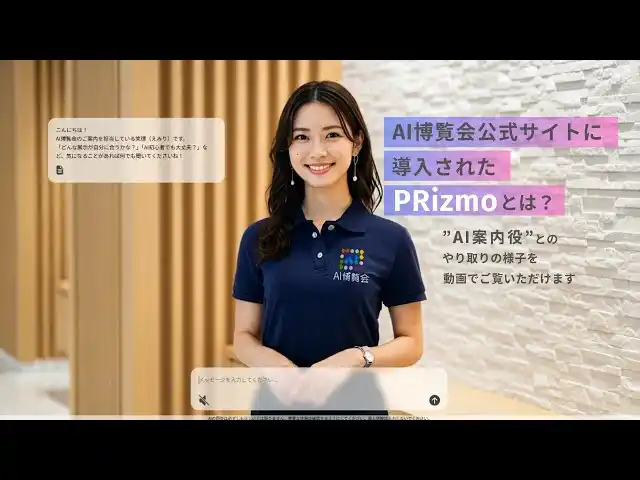 AI博覧会Summer2025公式Webサイトに”話しかけたくなる案内役”としてPRizmoを導入。来場予定者が「どこを見ればいい?」「初心者におすすめは?」といった不安や迷いを、自然な対話を通じて解消し、必要な情報にスムーズにアクセスできるよう支援します。 |