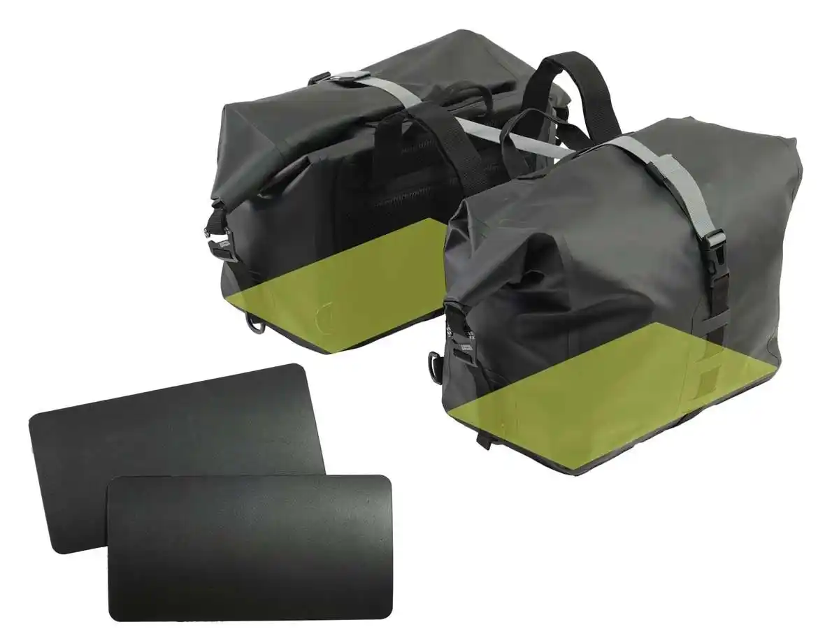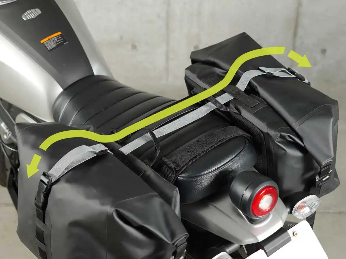 本製品は、浸水の原因となる縫い目の無い「ターポリン素材の熱圧着加工」と、マフラーへの干渉を抑えたシンプルなフォルムが特徴です。容量32L(片側16L)で日帰りから一泊二日のツーリングに対応するサイドバッグです |