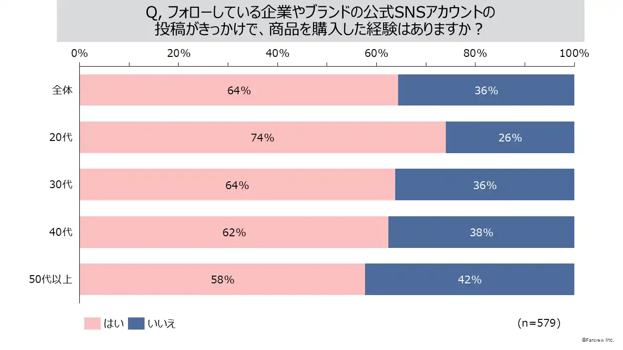 フォローしている企業やブランドの公式SNSアカウントの投稿がきっかけで商品を購入した経験がある64% |