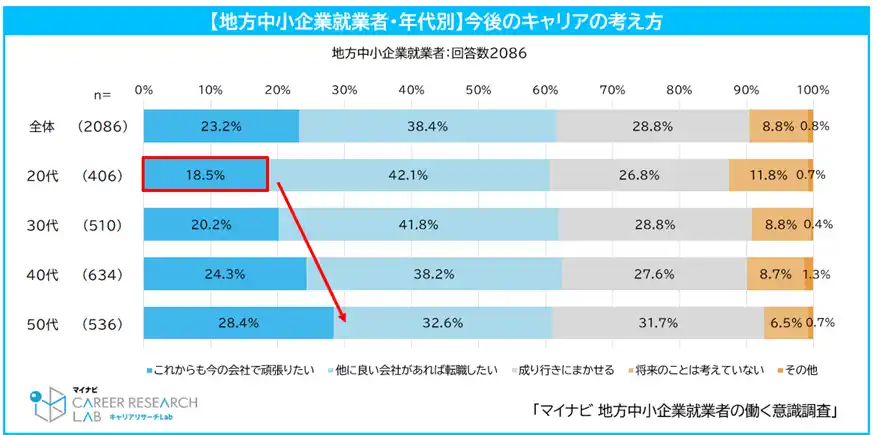 地方中小企業就業者のうち「これからも今の会社で頑張りたい」とした割合は約2割にとどまり、特に20代で現在の組織への定着意思が低い傾向が明らかになりました。 |