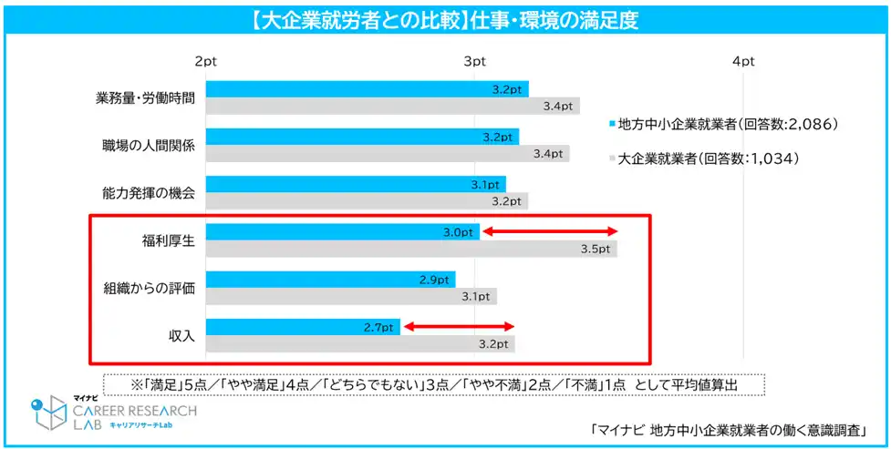 地方中小企業就業者のの約3人に1人が「他に良い会社があれば転職したい」。年代が若いほど今の職場への定着意識が低い傾向。大企業就業者と比較して「福利厚生」「収入」に不満と待遇満足度にギャップ