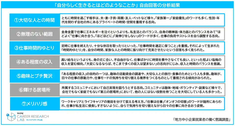 ◆地方中小企業就業者はキャリアにおいて「自分らしさ」を重視する志向。自分らしく生きる要素は「大切な人との時間」「仕事時間的ゆとり」「ある程度の収入」など |