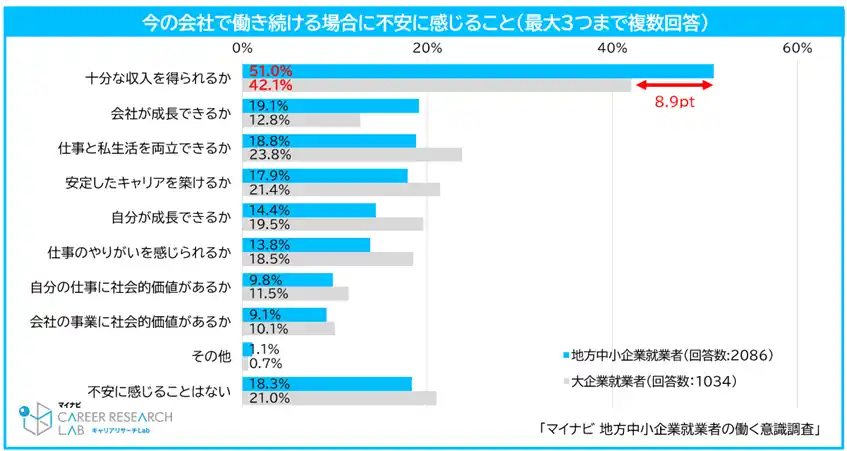 地方中小企業就業者の今の会社で働き続ける場合に不安に感じることは、「十分な収入を得られるか」が51.0%で最多となった。 |