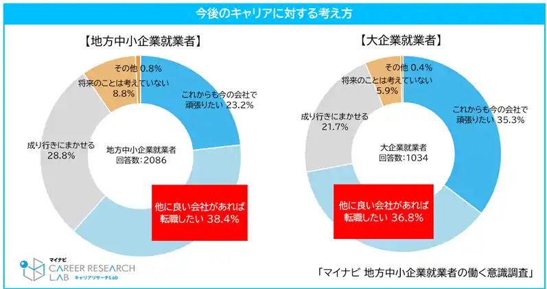 ◆地方中小企業就業者の約4割が「他に良い会社があれば転職したい」と回答。一方で「これからも今の会社で頑張りたい」は2割にとどまる。大企業就業者に比べて組織定着意識が低い傾向 |