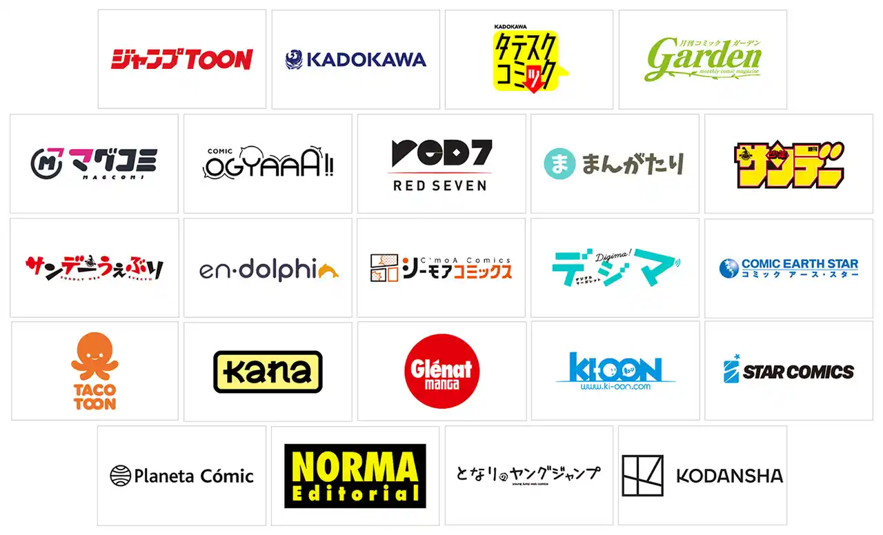 | ジャンプTOON、KADOKAWA、TATESC COMICS、月刊コミックガーデン、マグコミ、コミックオギャー!!、レッドセブン、まんがたり、少年サンデー、サンデーうぇぶり、エンドルフィン、シーモアコミックス編集部、デジタルマーガレット、コミック アース・スター、Tacotoon、Kana、Glenat Manga、Ki-oon、Star Comics、Planeta Comic、Norma Editorial、となりのヤングジャンプ、講談社 国際企画編集チーム | ||||||||||||