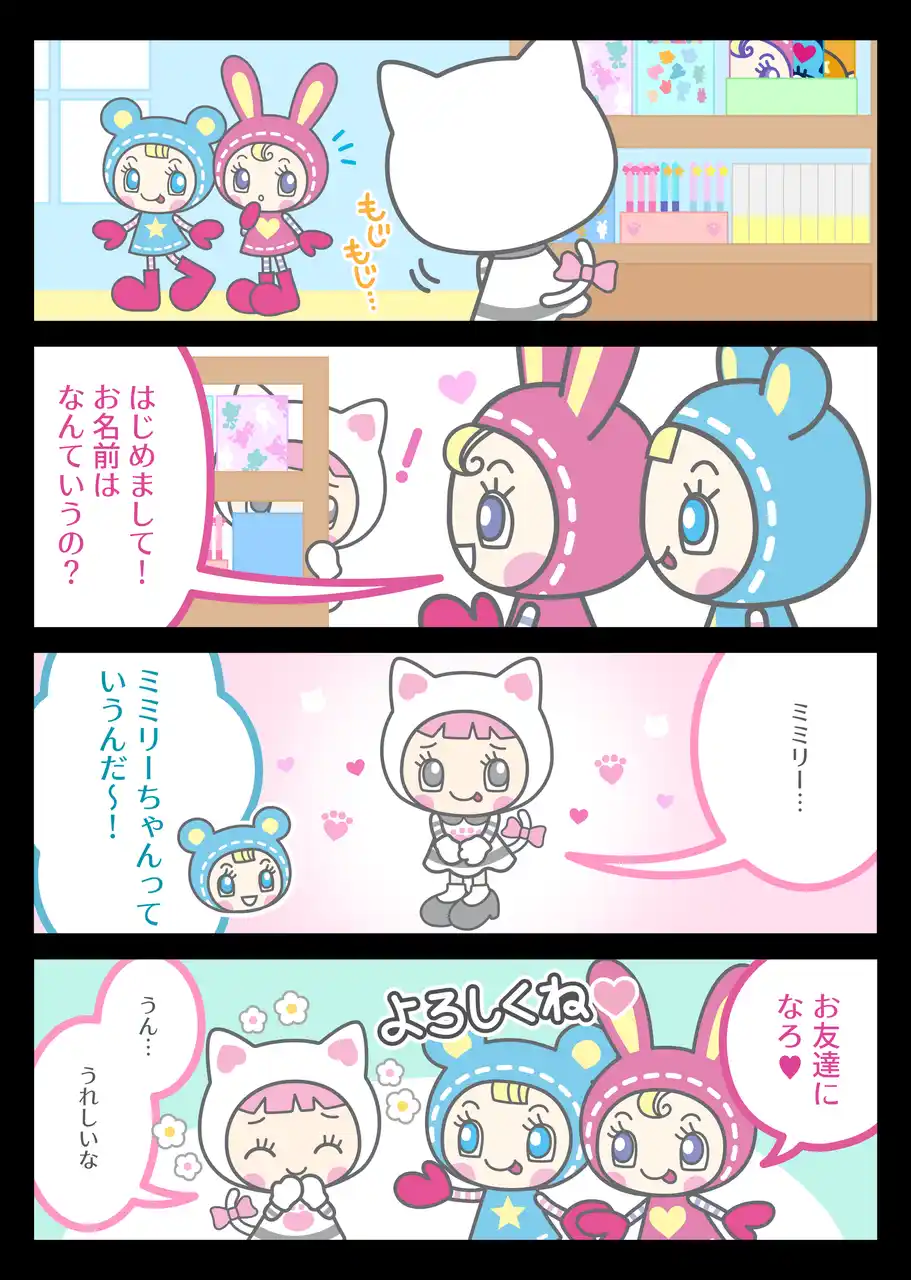 ナルミヤキャラクターズの新たな仲間として、「ミミリーちゃん」がデビューします。 ちょっぴり恥ずかしがり屋だけど、ファッションやトレンドが大好きな女の子。 ある日ふらっと立ち寄ったお店で、べリエちゃんとブルーべリエちゃんに出会い、 お友達になりました。 |