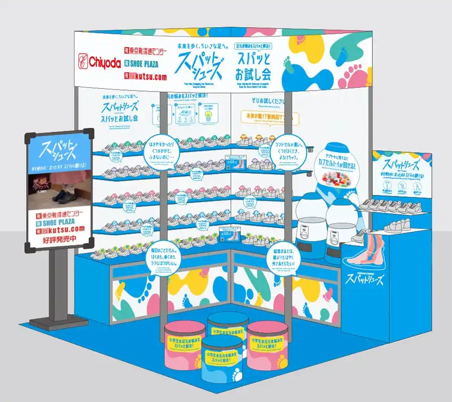 大阪・関西万博には国内のみならず、世界各国からの来場者が見込まれます。会場では、これからの未来を歩むお子様に「スパットシューズ」を実際に履いていただくお試し会を開催。今後の商品開発に活かすためのアンケートにご回答いただくと、消しゴムなどが当たるカプセルトイをプレゼントします。 |