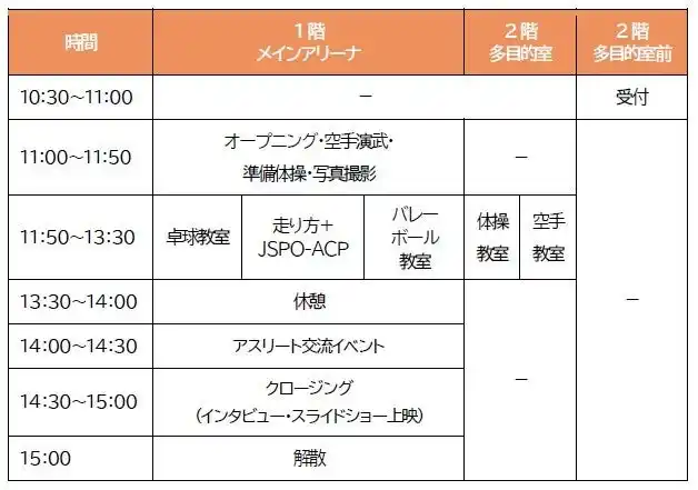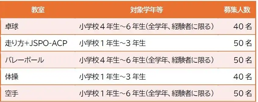 著名なアスリートが講師となり、卓球、バレーボール、走り方+JSPO-ACP、体操、空手の各教室を、小学生を対象に開催します(事前申込制)。 |