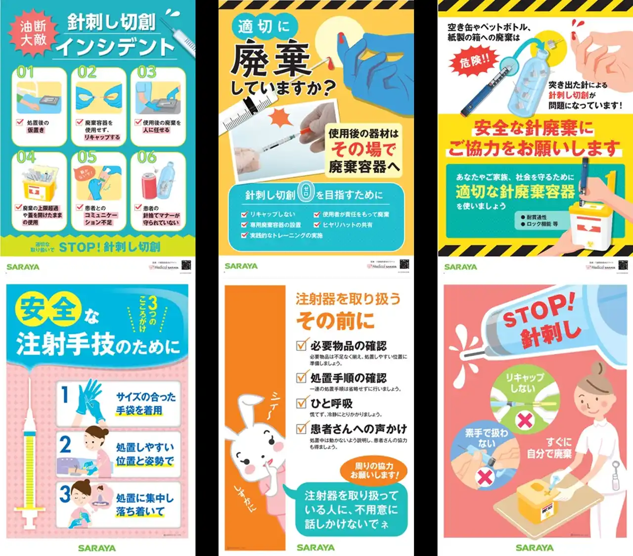 医療現場の安全、そして患者様への指導・啓発の一環として、針刺し切創の防止には定期的な教育や周知活動が重要です。Medical SARAYAおよびHygiene Shopでは、「針刺しゼロ」を目指すための啓発ポスター6種を2025年8月1日(金)から9月30日(火)まで期間限定で無料公開中です。 |