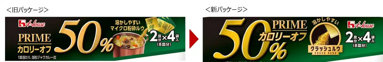 全アイテムでパッケージを変更し、健康ニーズに応える「カロリー・脂質50%オフ(※1)」や、固形ルウより油脂が少ない中でもおいしさを実現するハウス独自技術「クラッシュルウ」の魅力を改めて訴求することで、より幅広いお客様に健康とおいしさを両立したルウカレーを楽しんでいただくことを目指します。内容量は「プライムバーモントカレー」が103g、「プライムジャワカレー」が112g、希望小売価格383円(税別)。 |