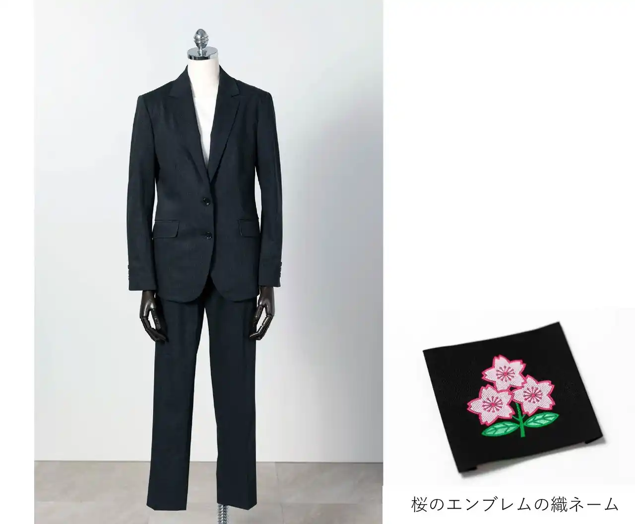 ジャケット:シングル2釦センターベント(桜のエンブレムの織ネーム入り)、フラップポケット |