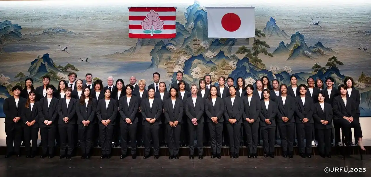 7月27日(日)に開催された壮行会でのスーツを着用したラグビー女子日本代表メンバー |