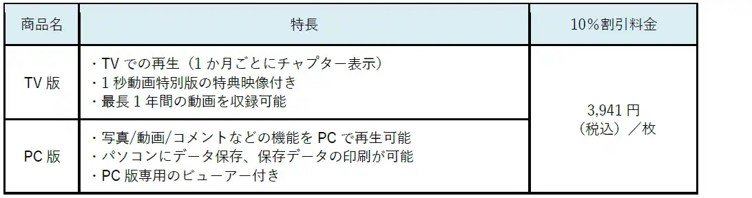 テレビで「みてね」の動画を楽しめる「TV版」と、写真も動画もコメントもすべてのデータをお手元に残せる「PC版」の2種類とも10%割引になります。 |