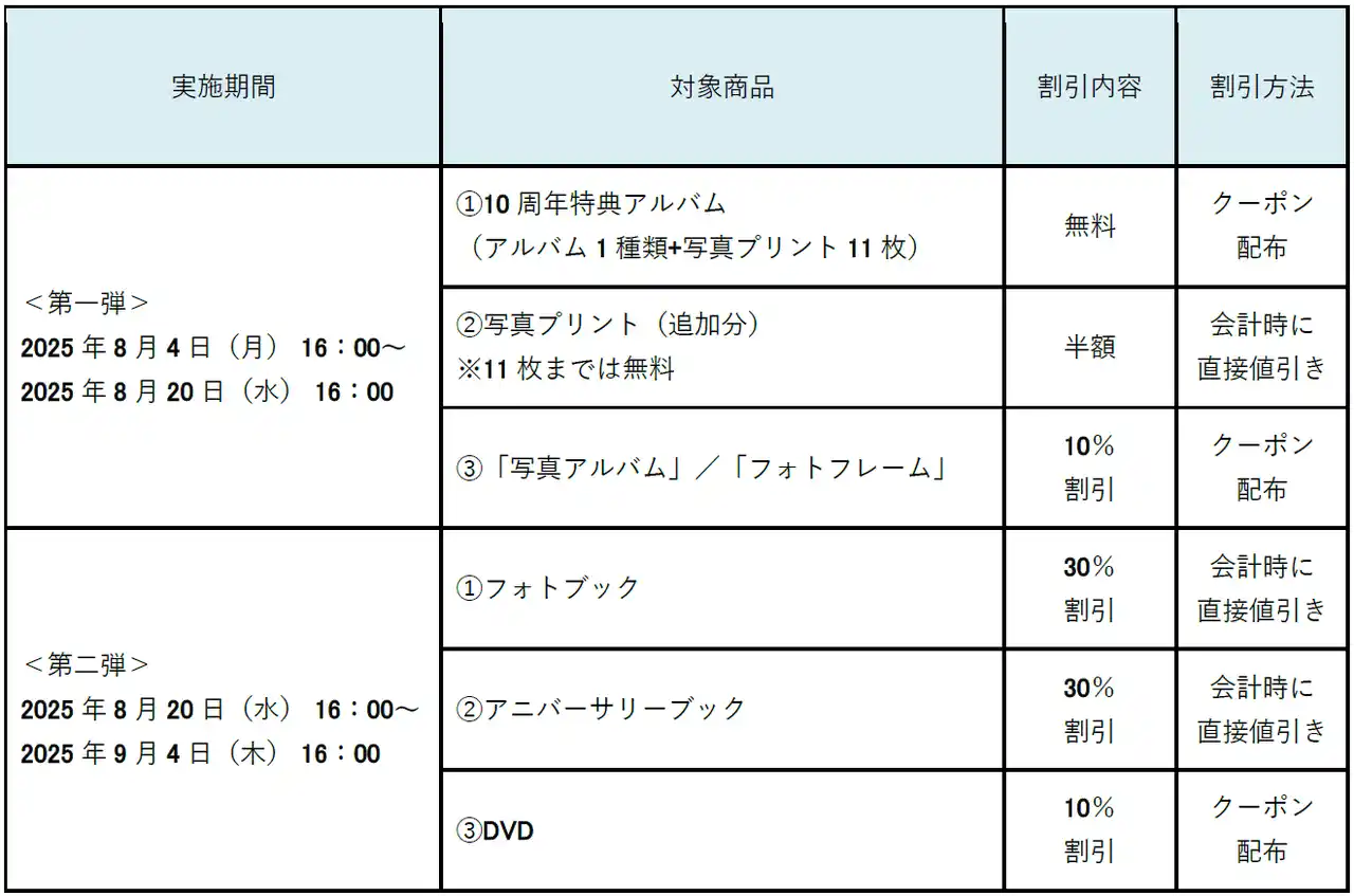 さらに第二弾では、「フォトブック」「アニバーサリーブック」「DVD」などの人気フォト商品が最大30%割引になるキャンペーンを展開予定です。 |