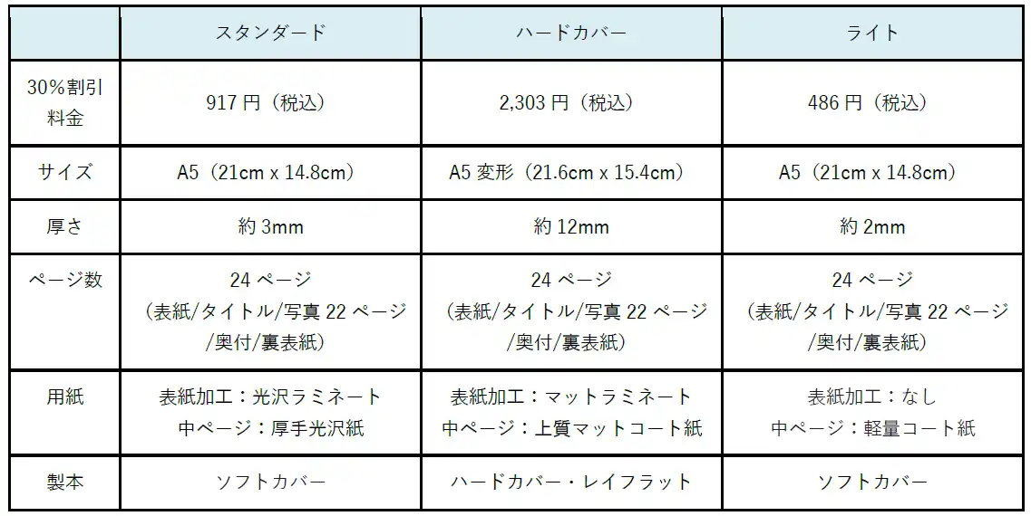 楽しかったあの瞬間の思い出を、一冊の物語として楽しめるフォトブックが何回でも・何冊でも30%割引に。高画質なスタンダード、特別な思い出にぴったりなハードカバー、気軽に作れるお手頃価格のライトの3種類の中から、目的に合わせてお選びいただけます。 |