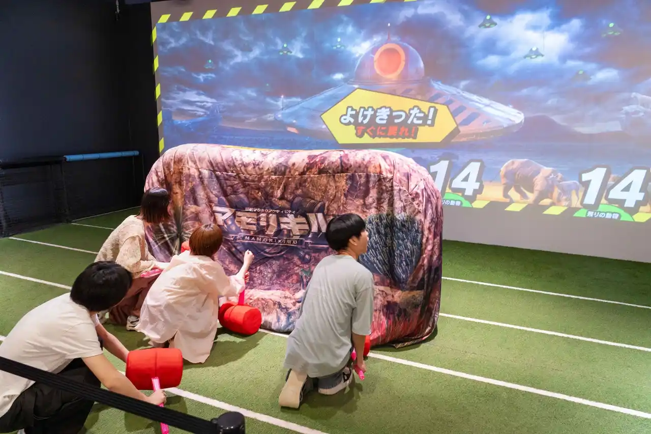 「マモリキル」は、巨大スクリーンの中で、猛獣たちを捕まえに次々と襲ってくるUFOをハンマーで叩きまくってみんなで協力して猛獣たちを守りきる、爽快感とスリルが味わえる『VS PARK』でしか体験できない新感覚アクティビティです。 |