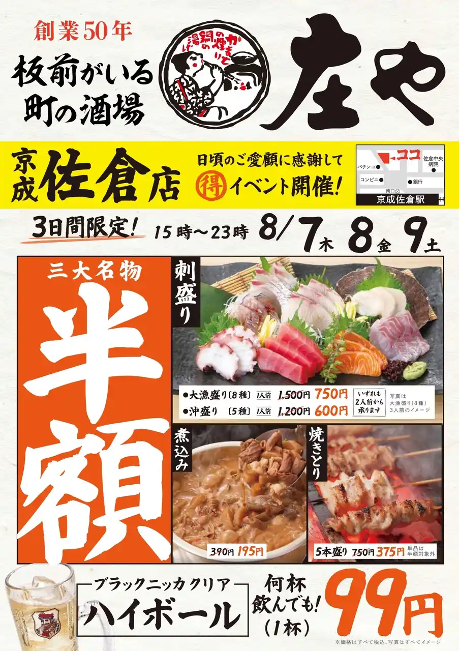 「はい!よろこんで」でお馴染みの“板前がいる町の酒場”『庄や』京成佐倉店(運営:株式会社大庄)は、2025年8月7日(木)より8月9日(土)までの3日間限定で、日頃のご愛顧に感謝を込め「刺身盛り合わせ」「煮込み」「焼き鳥」の三大名物を半額とする“半額感謝祭”を実施します。豊洲仲卸直送の鮮魚を使った刺身盛り合わせ「大漁盛り(8種盛)」は、通常1人前1,500円を半額の750円、同「沖盛り(5種盛)」は通常1人前1,200円を600円にて。加えて、不動の人気「煮込み」は通常390円を半額の195円。さらに、創業から受け継がれる味わい「焼きとり五本盛り」は、通常750円のところ半額の375円での超特価で提供します。