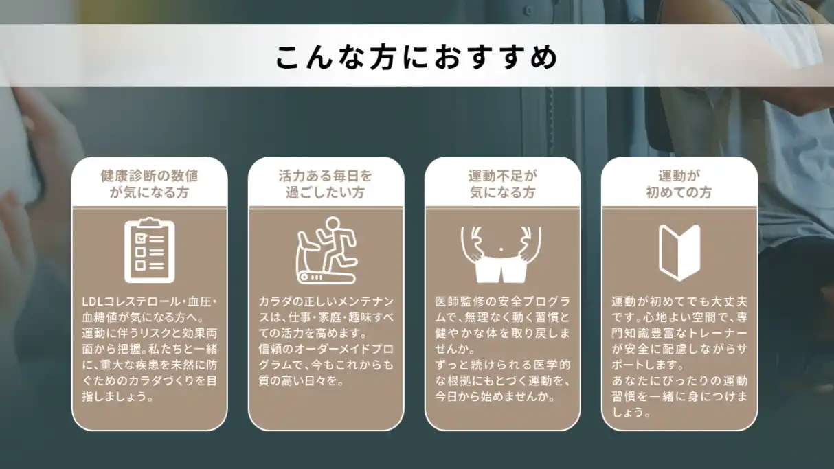 そんな方にこそ、医療と連携したあなた専用プログラムで、安全・安心に運動 を始められる |
