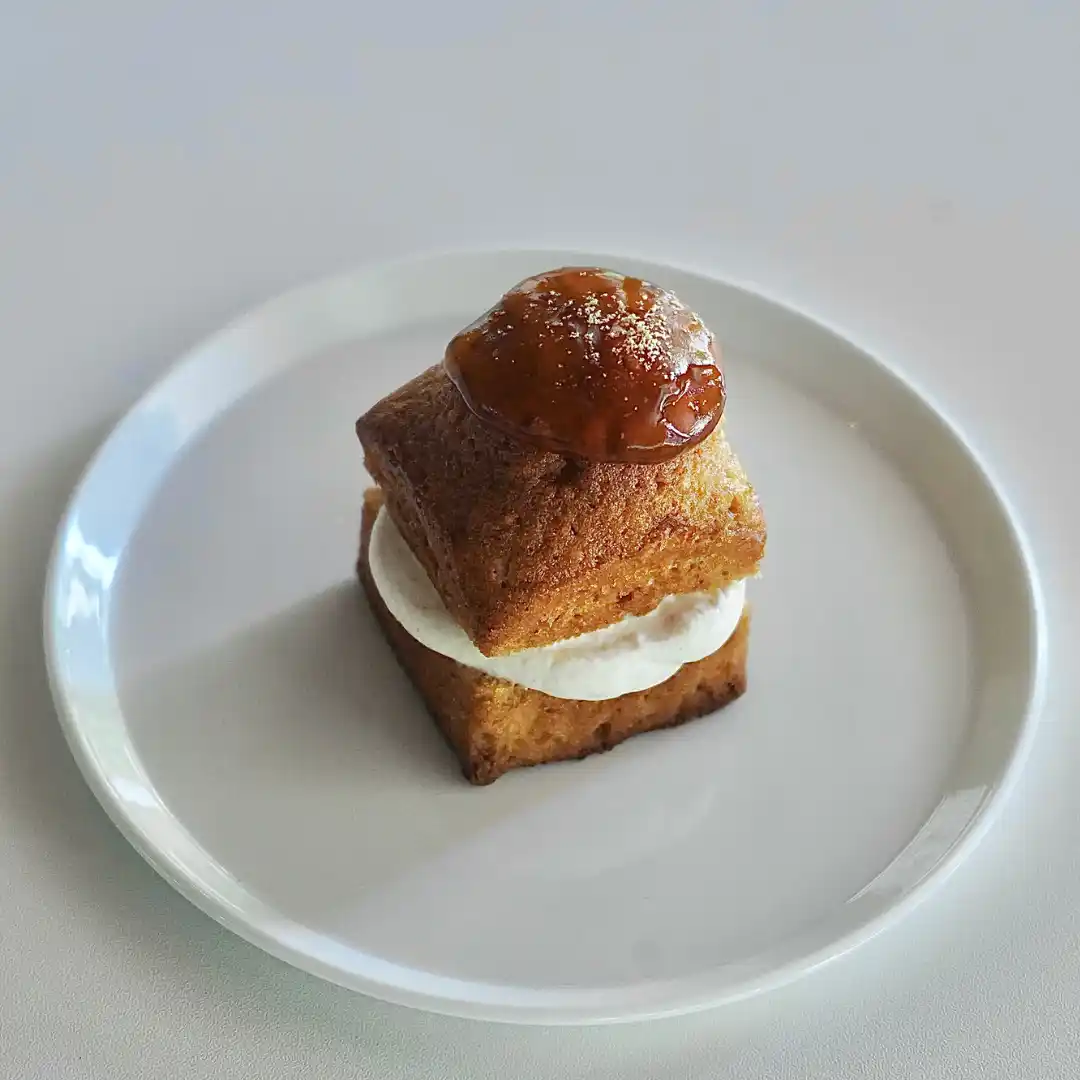 里SEASONingでも好評販売中の丸大豆醤油「もろみの雫」を生地に使用した、しっとり食感のパウンドケーキ。中には香ばしいきなこクリームをたっぷりサンドし、仕上げに甘じょっぱいみたらしソースをとろりとかけました。和と洋が調和した、カフェタイムにぴったりの贅沢スイーツです。 |