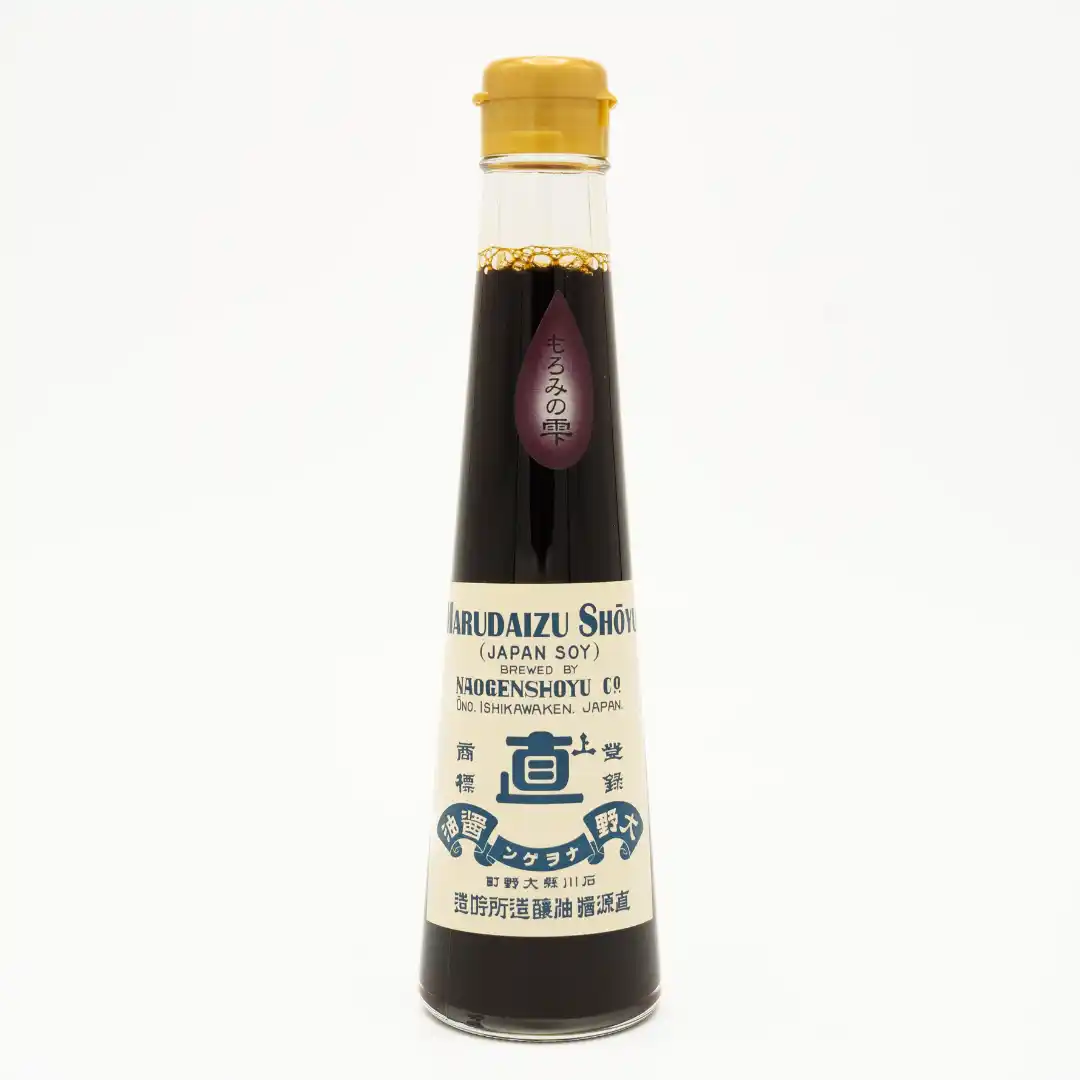 「もろみの雫」は、石川県金沢・大野の老舗蔵元「直源醤油」による、丸大豆を原料とした天然醸造のこだわり醤油。霊峰白山の伏流水を仕込み水に使い、大野の気候に委ねてじっくりと熟成されています。雑味のない深い旨みとまろやかな香ばしさが特長で、今回のスイーツに奥行きのある味わいを与えています。 |